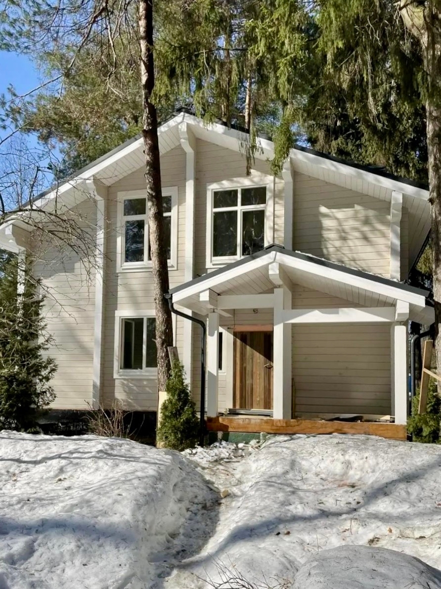 Это полностью индивидуальный проект нашего заказчика. Общая площадь дома составляет 186,85 квадратных метров. В строительстве мы использовали клееный брус собственного производства из сосны сечением 205х185 мм.