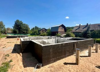 Наша бригада завершила заливку фундамента дома и бани. Площадь дома составляет 256,38 м2 и бани 164,3 м2. Оба строения являются полностью индивидуальными проектами нашего заказчика.