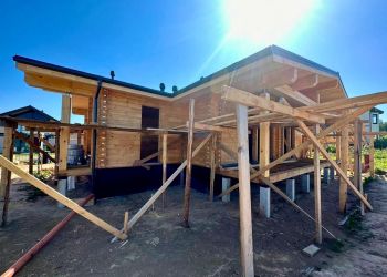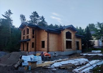 Мы ведем работы по сборке сруба дома. Далее наша бригада приступит к монтажу стропильной системы. В строительстве мы используем клееный брус собственного производства из сосны с сечением 245х185 мм. Это индивидуальный проект нашего заказчика. Одноэтажный дом с мансардой. Общая площадь дома 190,64 м2.