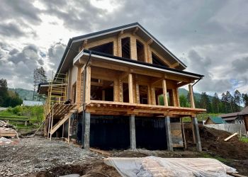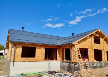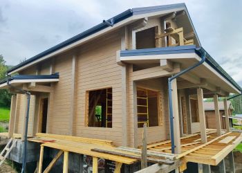 Сейчас наша бригада завершила монтаж финишного покрытия кровли в доме. Дом построен из клееного бруса собственного производства из лиственницы с сечением 185х245 мм. Общая площадь дома составляет 428 квадратных метров.