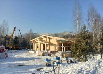 Завершили сборку сруба и монтаж стропильной системы в селе Манжерок, республика Алтай