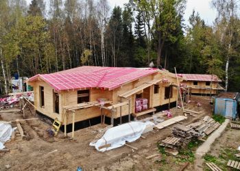 Также наша бригада законсервировала кровлю на зиму. Площадь дома составляет 354 квадратных метра. Всего будет построено 3 здания по индивидуальному проекту нашего заказчика. В строительстве мы используем клееный брус собственного производства из сосны с сечением 185х285 мм.