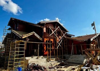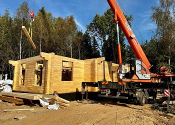 Наша бригада выполнила разгрузку последний части домокомплекта и приступила к финальному этапу сборки сруба. Уже готов сруб и стропильная система бани. Мы разработали индивидуальный проект для заказчика. Всего на участке мы построим 3 здания — гараж, дом и баню.