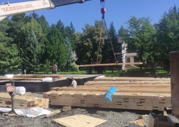 Всего будет построено 3 здания из клееного бруса по индивидуальному проекту нашего заказчика. Сейчас бригада приступила к сборке первого сруба. Его общая площадь составляет 354 квадратных метра. В строительстве мы используем клееный брус собственного производства из сосны с сечением 185х285 мм.