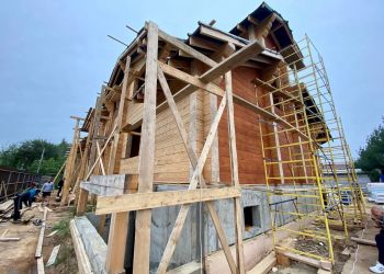Сейчас наша бригада выполняет внешнее окрашивание дома, а также продолжает монтаж кровельного пирога. Далее мы приступим к финишному покрытию кровли. Дом строится по индивидуальному проекту нашего заказчика. Общая площадь дома составляет 684 квадратных метра.