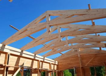 Наша бригада продолжает вести строительство гаража. Сейчас мы приступаем к укладке кровельного покрытия. Была выбрана цеметно-песчаная черепица фирмы Braas.Площадь гаража составляет 70,5 квадратных метров. В строительстве мы используем клееный брус собственного производства из сосны с сечением 205х185 мм.