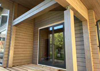 Дом построен из клееного бруса собственного производства из сосны сечением 205х185 мм. Это индивидуальный проект нашего заказчика. Общая площадь дома составляет 235 квадратных метров.