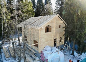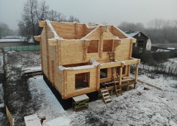 Мы продолжаем строить дом и сейчас наша бригада выполняет работы по монтажу стропильной системы. В строительстве мы использовали клееный брус собственного производства из сосны сечением 205х185 мм. Это полностью индивидуальный проект нашего заказчика. Площадь дома 170 квадратных метров.