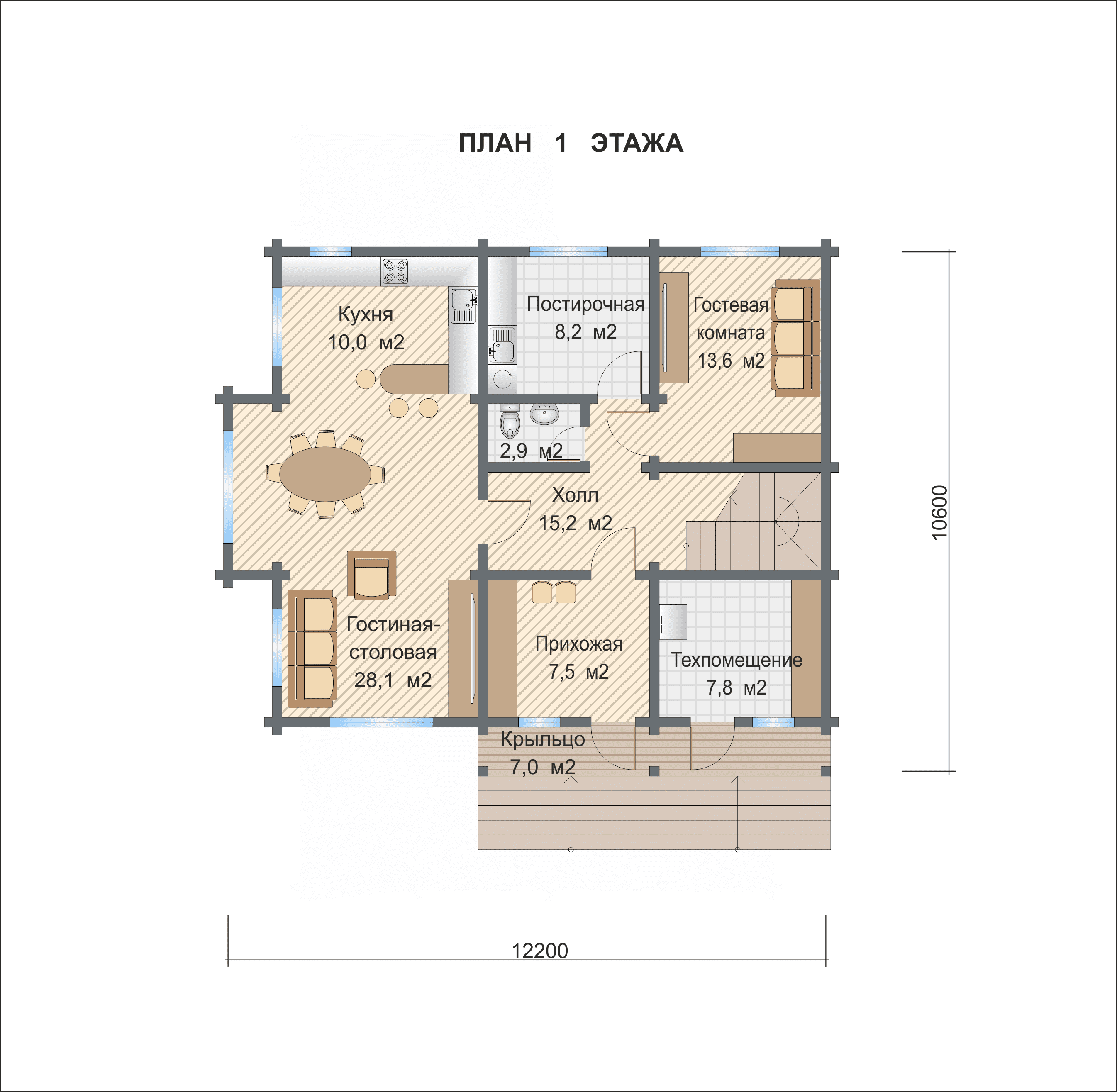 Полезная площадь проекта "Эрвальд" - 165.7 кв.м. По проекту "Эрвальд" - двухэтажное здание, которое также оснащено большим крыльцом. Площадь крыльца составляет - 7 кв.м.