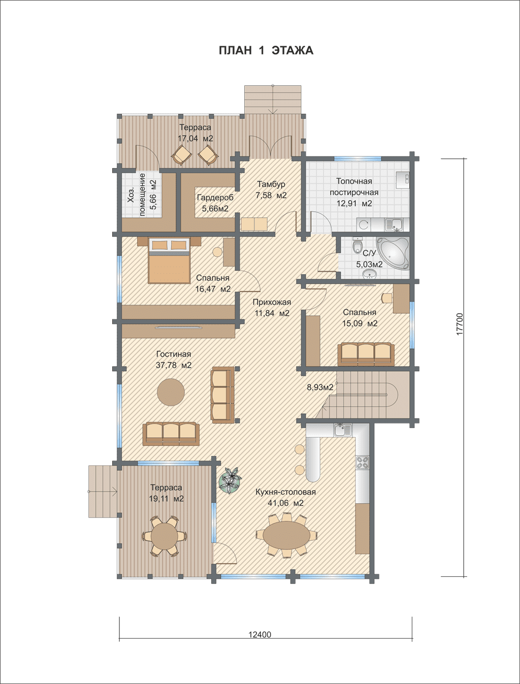 Полезная площадь проекта "Морелия" - 292 кв.м. По проекту "Морелия" - двухэтажное здание, которое также оснащено крыльцом и террасой. Площадь крыльца и террасы - 19,11 кв.м.