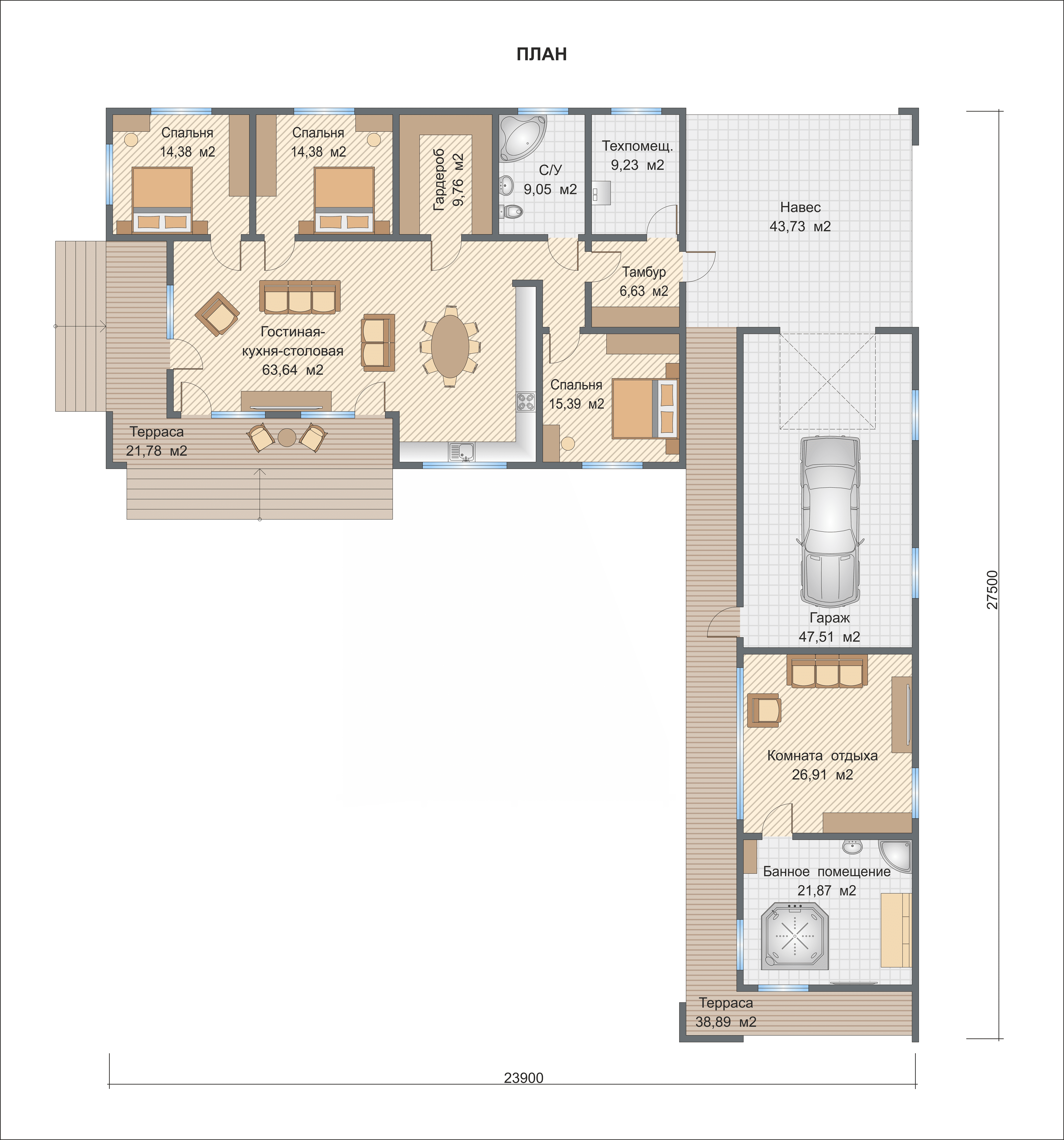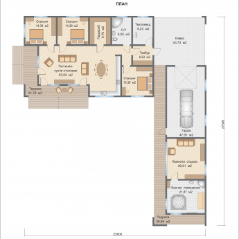 По проекту "Таланс" - одноэтажное здание, которое также оснащено двумя большими открытыми террасами. Площадь террас составляет - 60,67 кв.м.