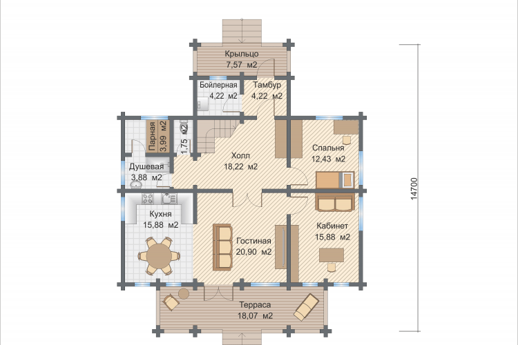 Полезная площадь проекта "Зерфаус" - 224 кв.м. По проекту "Зерфаус" - двухэтажное здание, которое также оснащено крыльцом и террасой. Площадь крыльца составляет - 7,57 кв.м., площадь террасы - 18,07 кв.м.