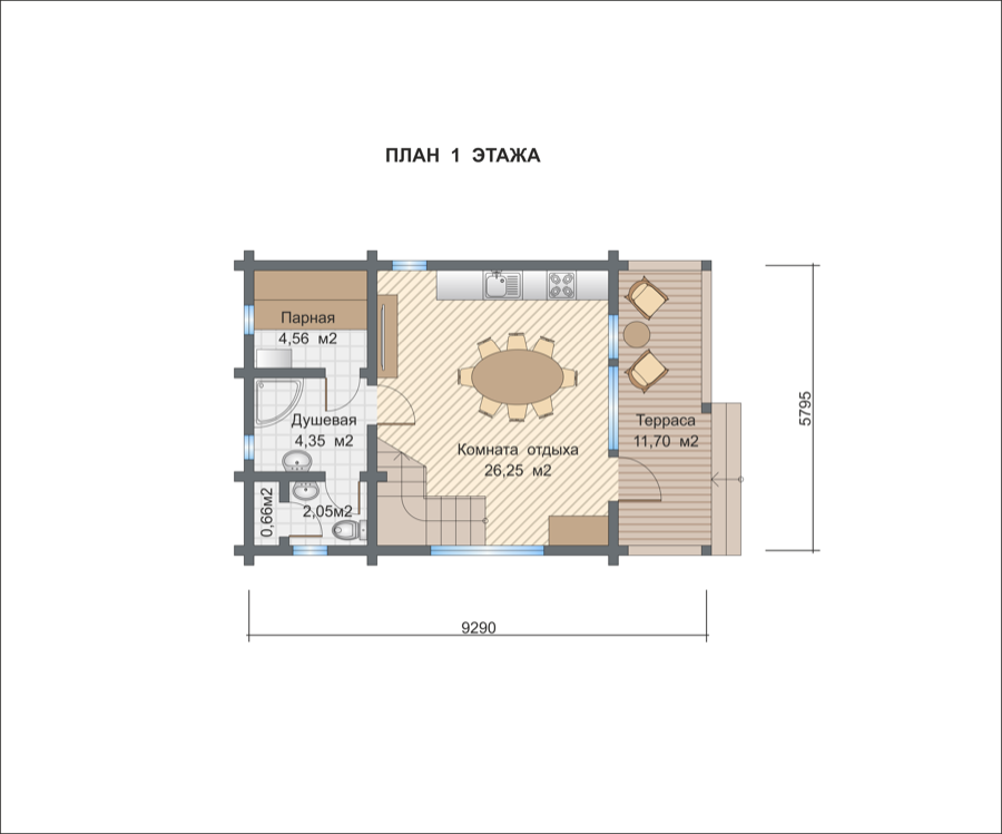 На первом этаже дома-бани расположены банный комплекс, санузел и комната отдыха с небольшой кухней. Антресольный этаж предполагается использовать как спальню.